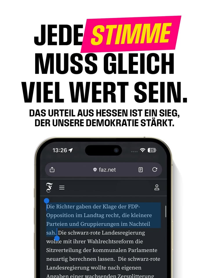 Jede Stimme muss bei einer Wahl gleich viel wert sein. 🗳️ Das Urteil aus Hessen stärkt unsere Demokratie: Die @fdp_hlt siegt vorm Hessischen Staatsgerichtshof und verhindert so die verfassungswidrige Kommunalwahl-Reform von CDU und SPD, welche die Wahlergebnisse zu Ungunsten kleinerer Parteien massiv verzerrt hätte. Ein Sieg für faire Kommunalwahlen im März!